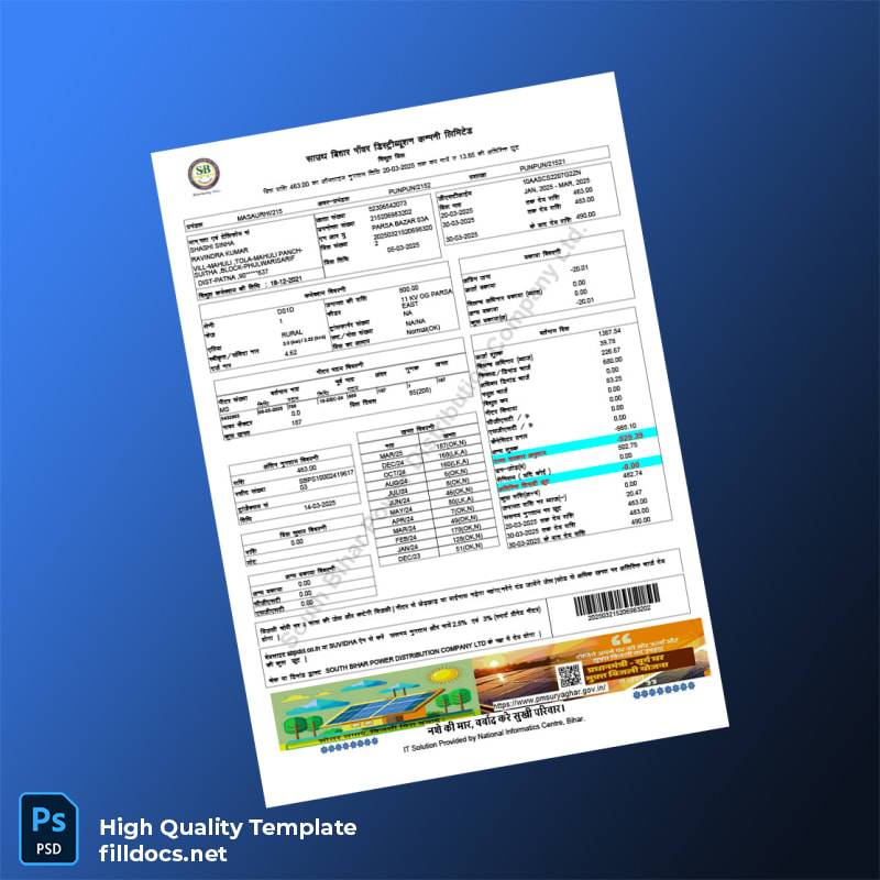 The India South Bihar Power Distribution Company Ltd Editable Utility Bill Template offers a professional, easy-to-use solution for generating authentic-looking utility bills in both Word and PDF formats. Whether you need a utility bill proof of address template for verification purposes or a quick replacement for a lost or expired document, this template ensures seamless customization and fast results.