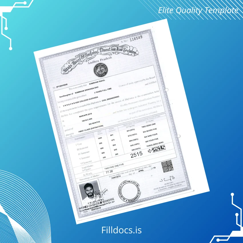 This template is a fillable diploma certificate tailored specifically for the India V Krishna Reddy College of Engineering Diploma in Civil Engineering. It is a blank diploma form that allows users to input names, dates, course details, and signatures directly into the template. This ensures a seamless and professional replacement diploma or novelty diploma design that looks authentic and is suitable for official academic representation.