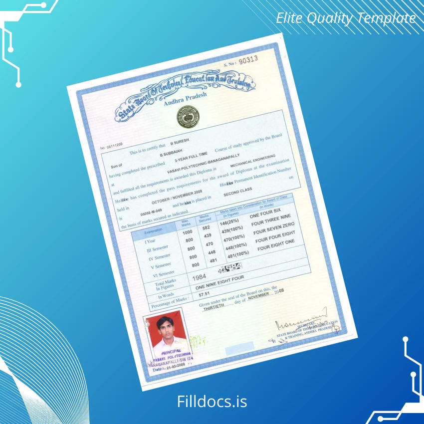 This India Vasavi Polytechnic-Banganapally Diploma in Mechanical Engineering Template – Word/PDF is a meticulously designed, fillable diploma certificate template crafted for professionals seeking a reliable and customizable solution for their academic document needs. Ideal for educators, administrators, and diploma holders requiring a swift replacement or a blank certificate form, this high-quality template offers an efficient way to generate polished diplomas with personalized data inputs.