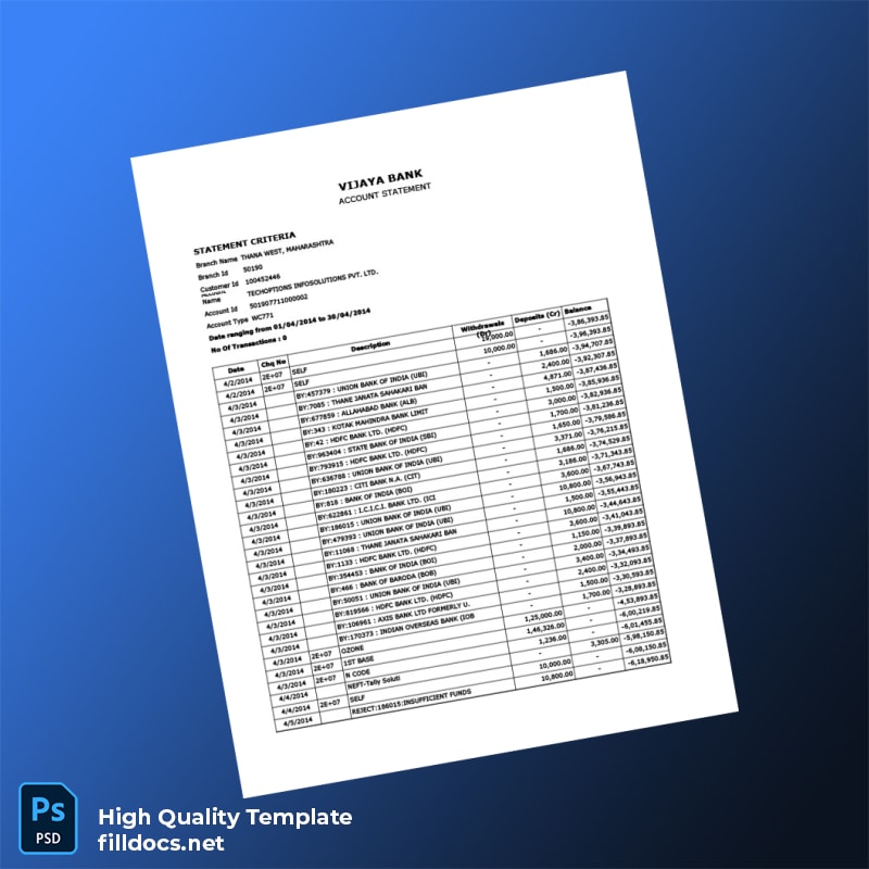 Are you faced with the headache of needing a professional bank statement but struggling to access your own? The India Vijaya Bank Statement Template in Word and PDF formats offers an efficient solution that saves you time and effort while providing all the essentials you need.