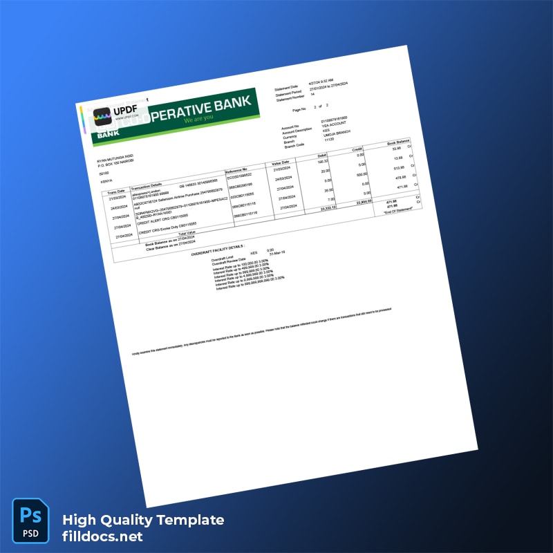 Kenya Cooperative Bank Statement Template in Word and PDF Formats
