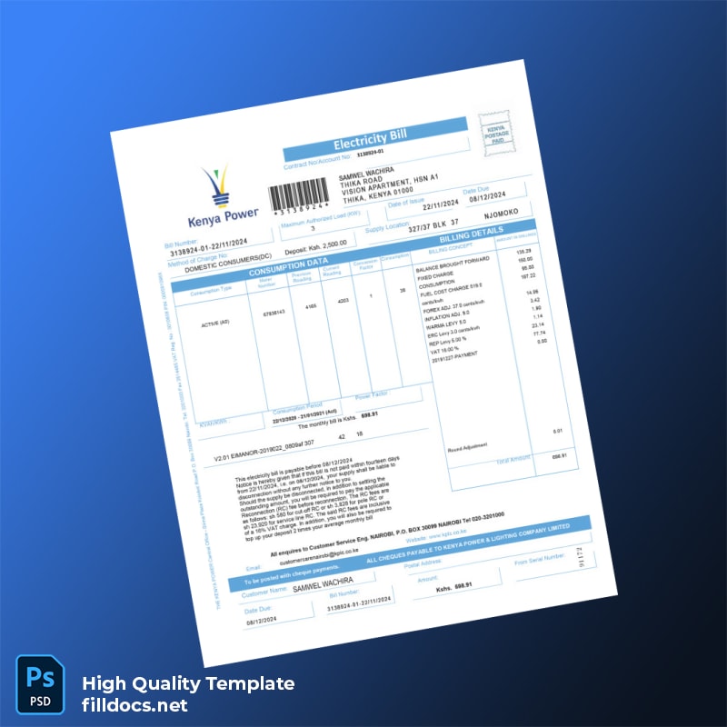 This template replicates authentic billing information from Kenya Power and Lighting Company, making it perfect for proof of residence, identity verification, or other administrative processes.