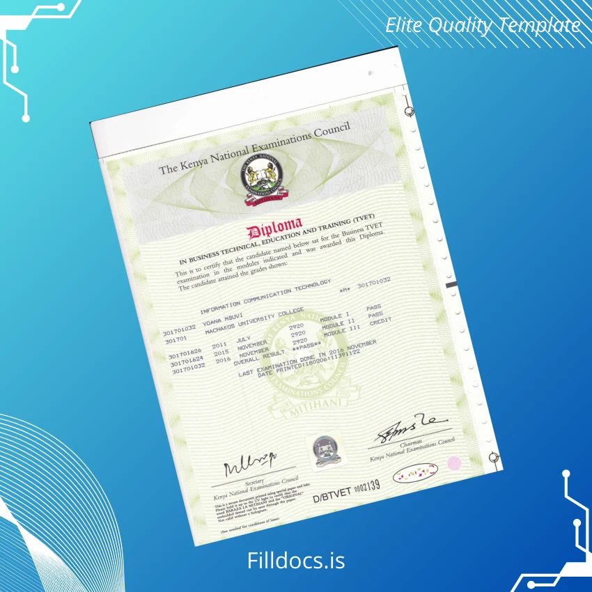 This template is a professionally crafted blank diploma form that represents the official Kenya Machakos University College Diploma in Information Communication Technology. It is designed to be user-friendly and editable, providing a novel diploma design which meets academic presentation standards while allowing for customization and swift replacements.
