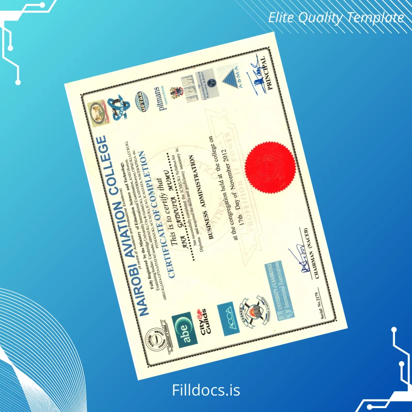 Discover the Kenya Nairobi Aviation College Diploma in Business Administration Template – Word/PDF, a professionally designed, fillable certificate perfect for individuals needing a customizable and print-ready diploma. This template offers a seamless solution for graduates and professionals requiring a polished and editable diploma form that accurately represents their academic achievements in Business Administration.