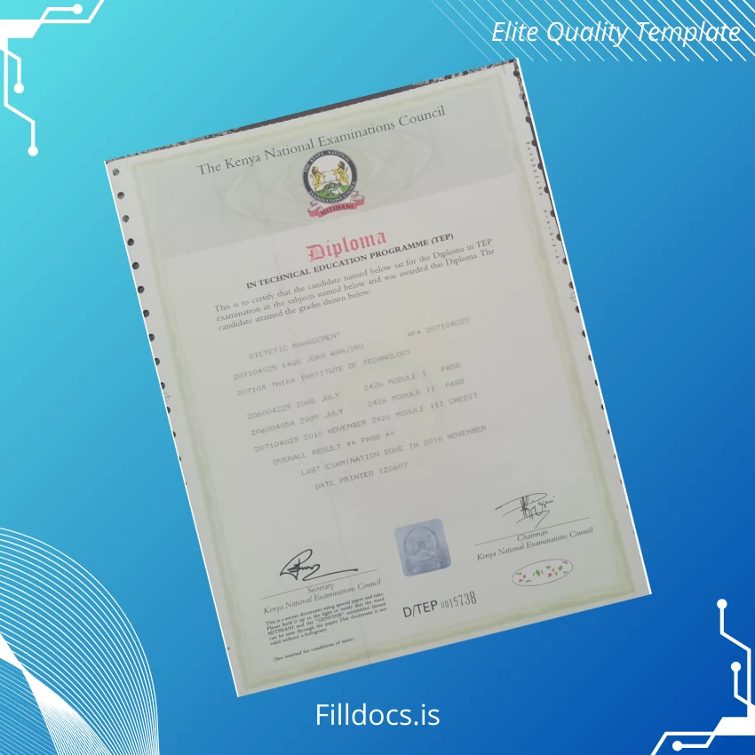This template represents a sophisticated, editable diploma designed specifically for the Kenya Thika Institute of Technology’s Technical Education Programme. It serves as a comprehensive blank diploma form that users can customize digitally. Its design is tailored for official use, making it a perfect option for timely replacement diplomas or presentation certificates that require a personalized touch.