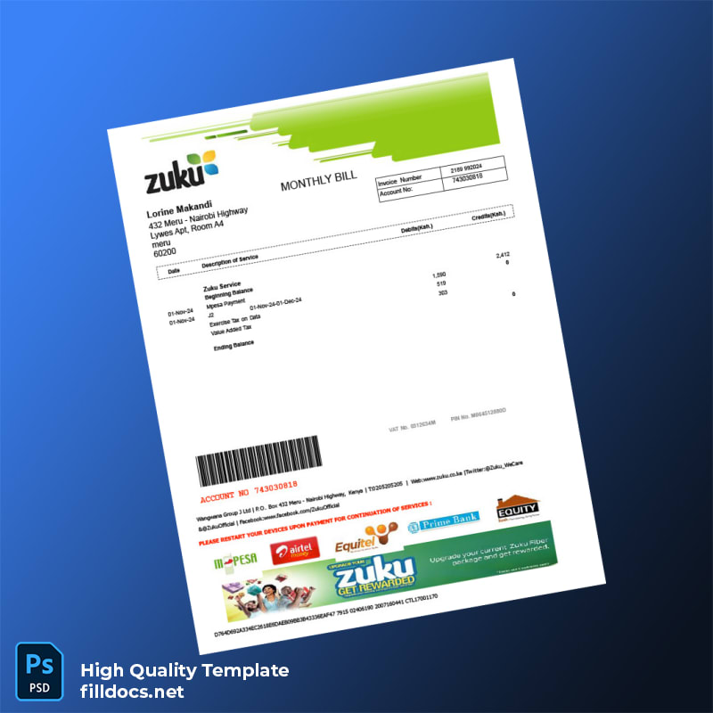 Kenya Wangwana Group J Ltd Editable Utility Bill Template in Word and PDF Formats
