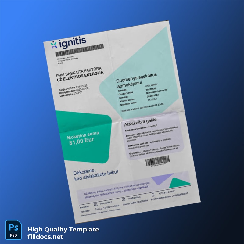 - Clear layout mimicking official Lithuania UAB Ignitis bills for realistic presentation