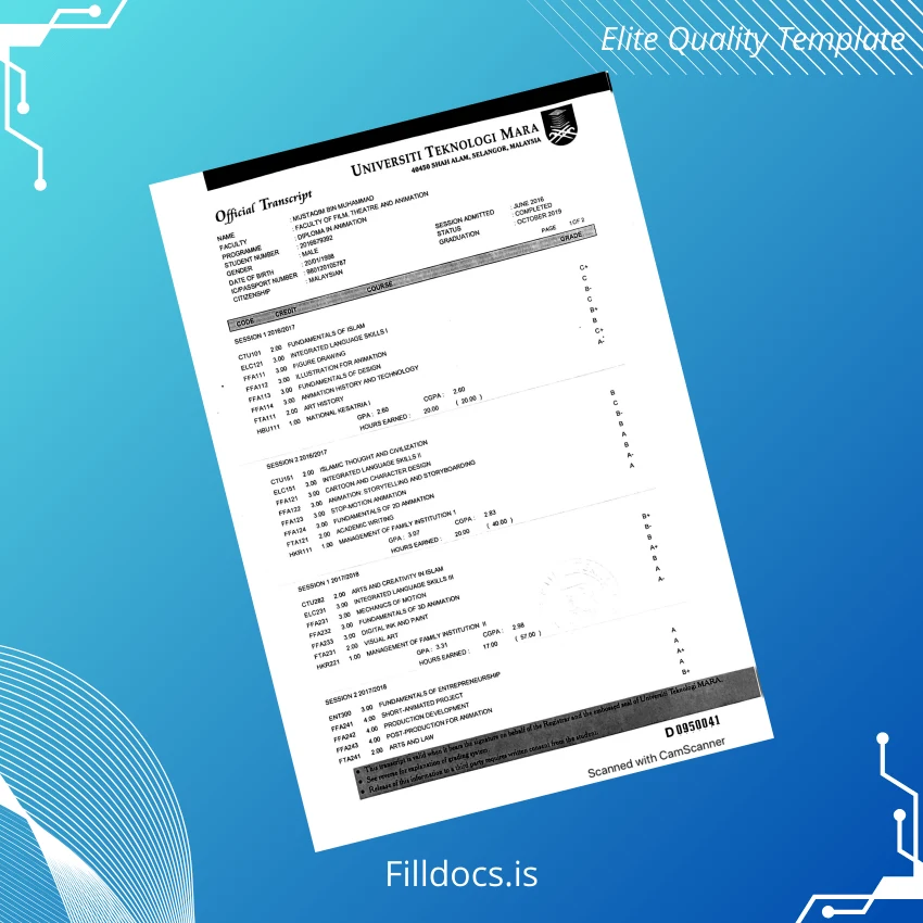 This Malaysia Universiti Teknologi Mara Diploma in Animation Template – Word/PDF is a professional, fillable diploma certificate designed specifically for creative and administrative professionals who require a reliable, customizable degree template. Whether you need a replacement diploma or want a novel, digital diploma download option, this template offers a seamless solution for academic document replication.