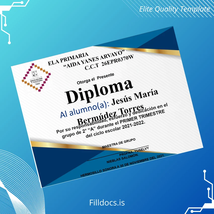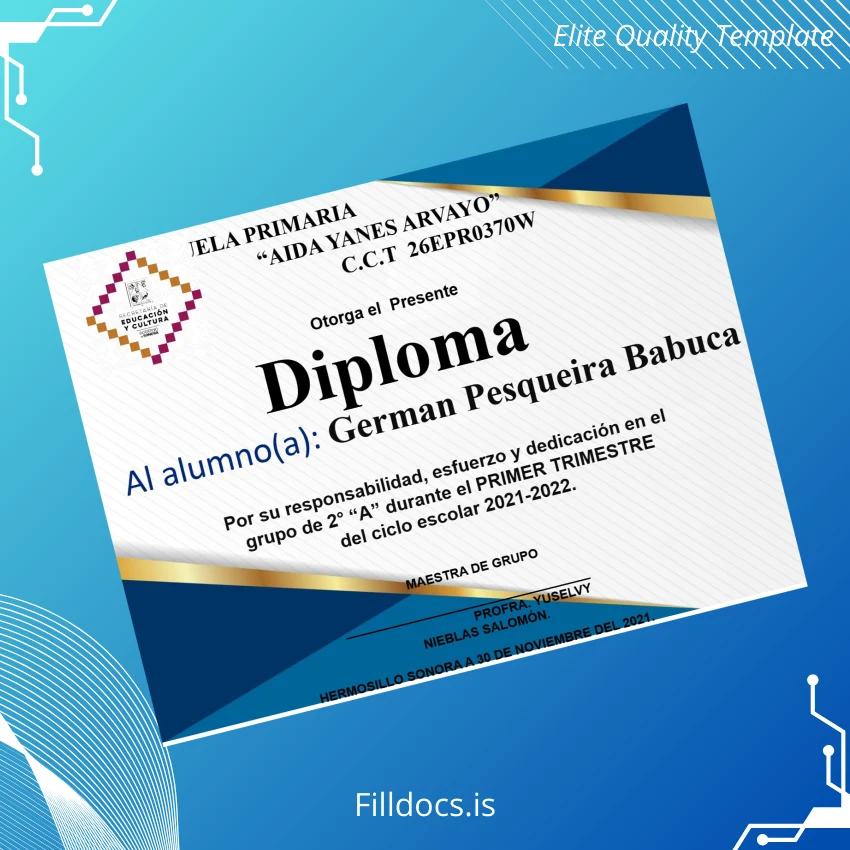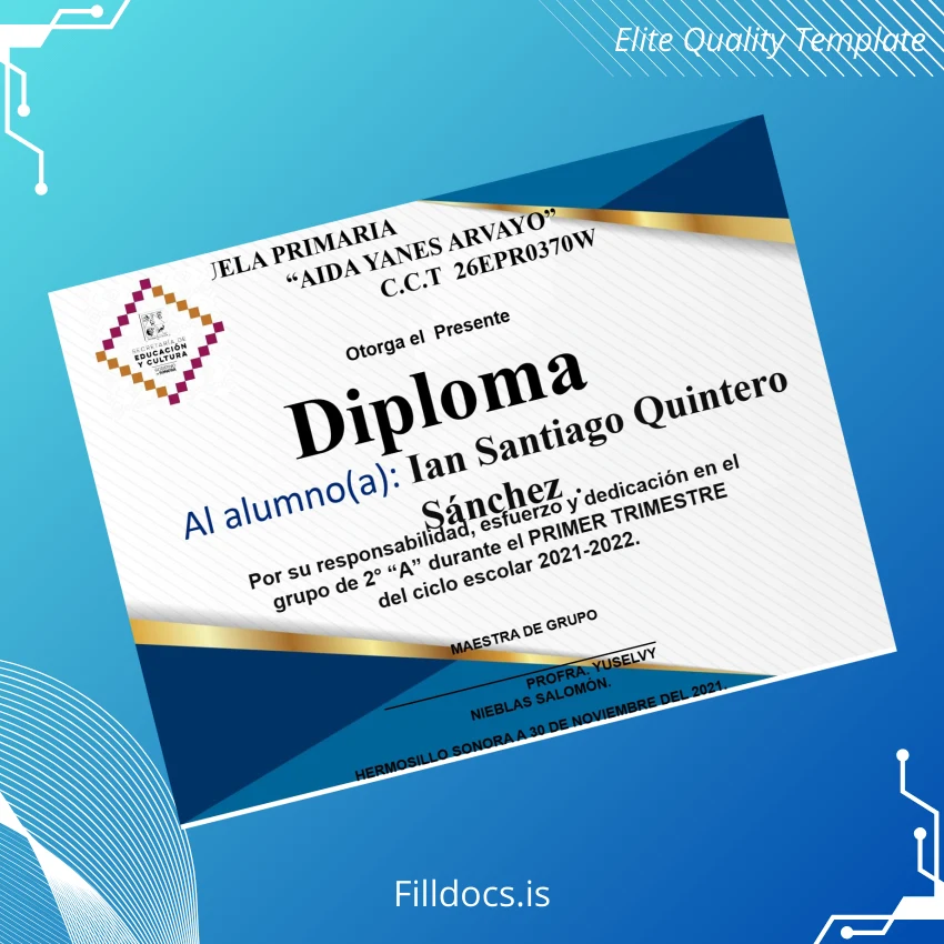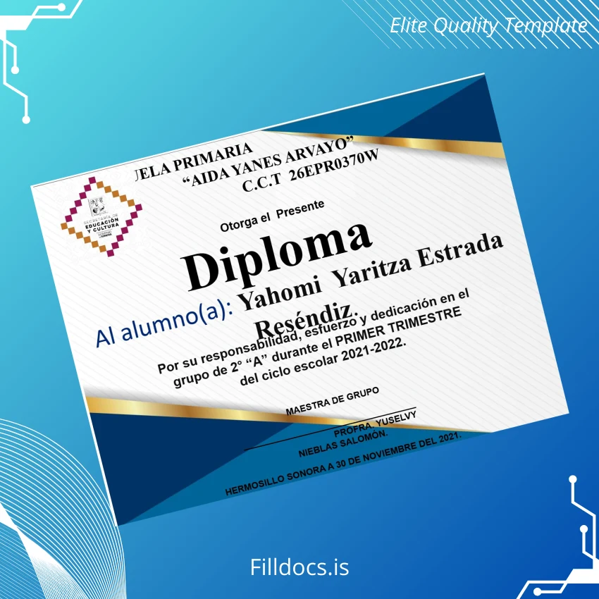 Discover the Mexico Aida Yanes Arvayo Primary School Diploma Template – Word/PDF, a high-quality, editable certificate designed for educators, schools, and administrators seeking a fast and reliable solution to generate official diplomas. This fillable document template simplifies the process of creating professional diplomas with customizable fields that allow you to enter names, dates, and other essential details effortlessly.