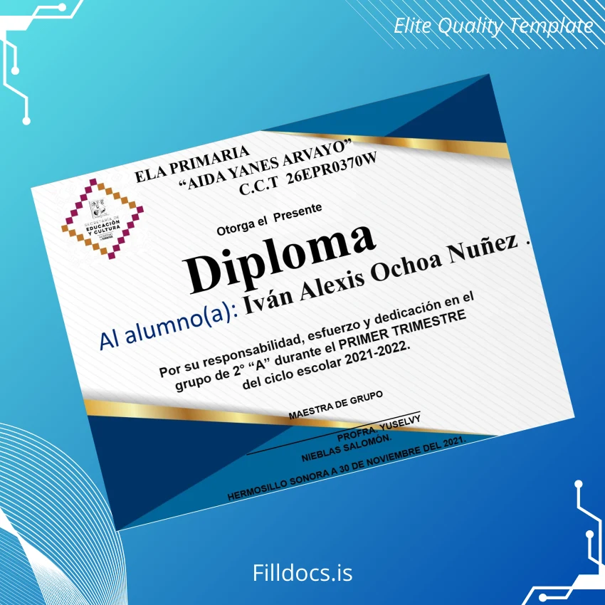 Mexico Aida Yanes Arvayo Primary School Diploma Template – Word/PDF fillable and print-ready for easy, professional diploma customization and replacement.