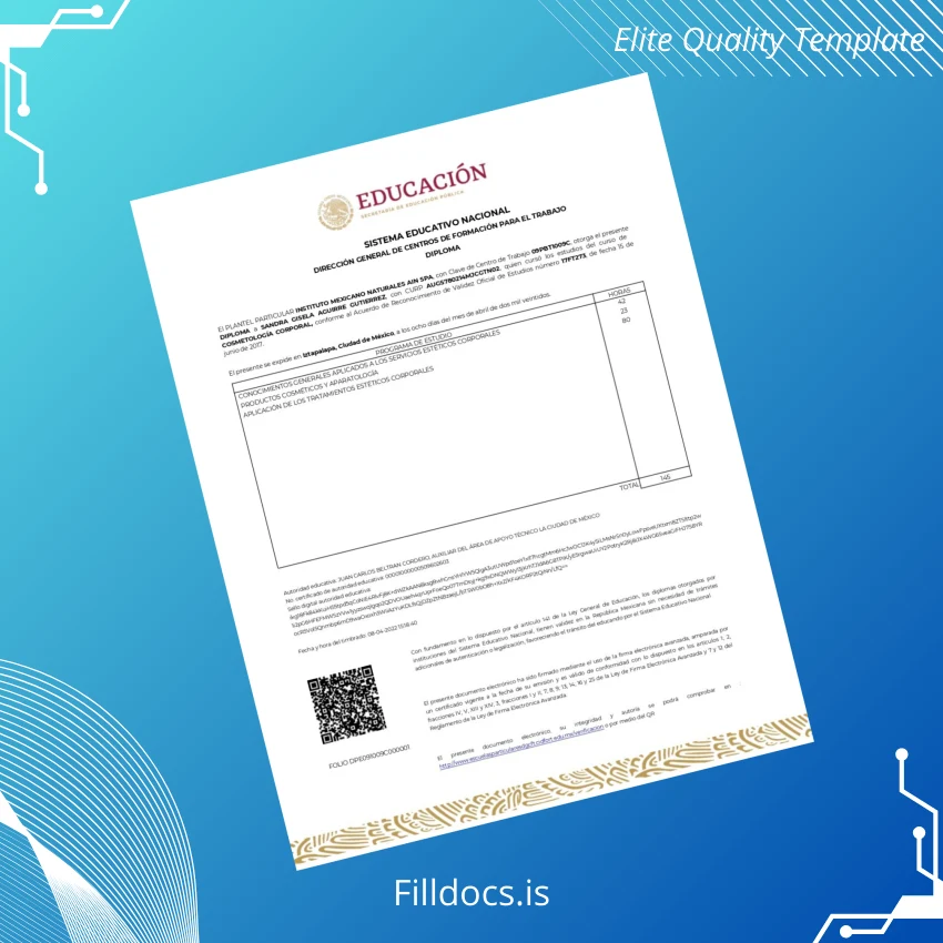 Discover the Mexico Instituto Mexicano Naturales AIN SPA Diploma Template – Word/PDF, a meticulously crafted fillable certificate designed for professionals requiring a customizable and authentic academic diploma. This editable diploma template offers flexibility for users needing to recreate or replace lost or outdated diplomas with ease and professionalism. It caters especially to educators, institutions, or individuals seeking a seamless solution to produce official-looking documents digitally.