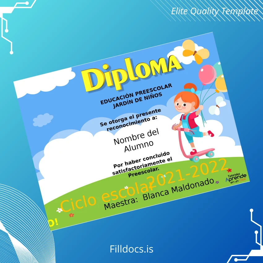 This template is a versatile, editable diploma form created specifically for kindergarten graduations in Mexico. It provides users with a blank diploma layout featuring novel design elements that ensure a polished appearance. Ideal for educators, administrators, and educational institutions requiring a quick, trustworthy certificate solution, this Word and PDF combination lets you generate customized diplomas efficiently.