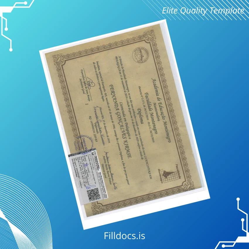 This template is a sophisticated and editable diploma design tailored specifically for the Faculty of Education in Montenegro. It provides users with a fully customizable framework allowing insertion of names, dates, and other academic credentials. Whether you require a replacement diploma template or a blank form for new graduates, this product offers a stylish and precise layout compatible with modern digital editing tools.