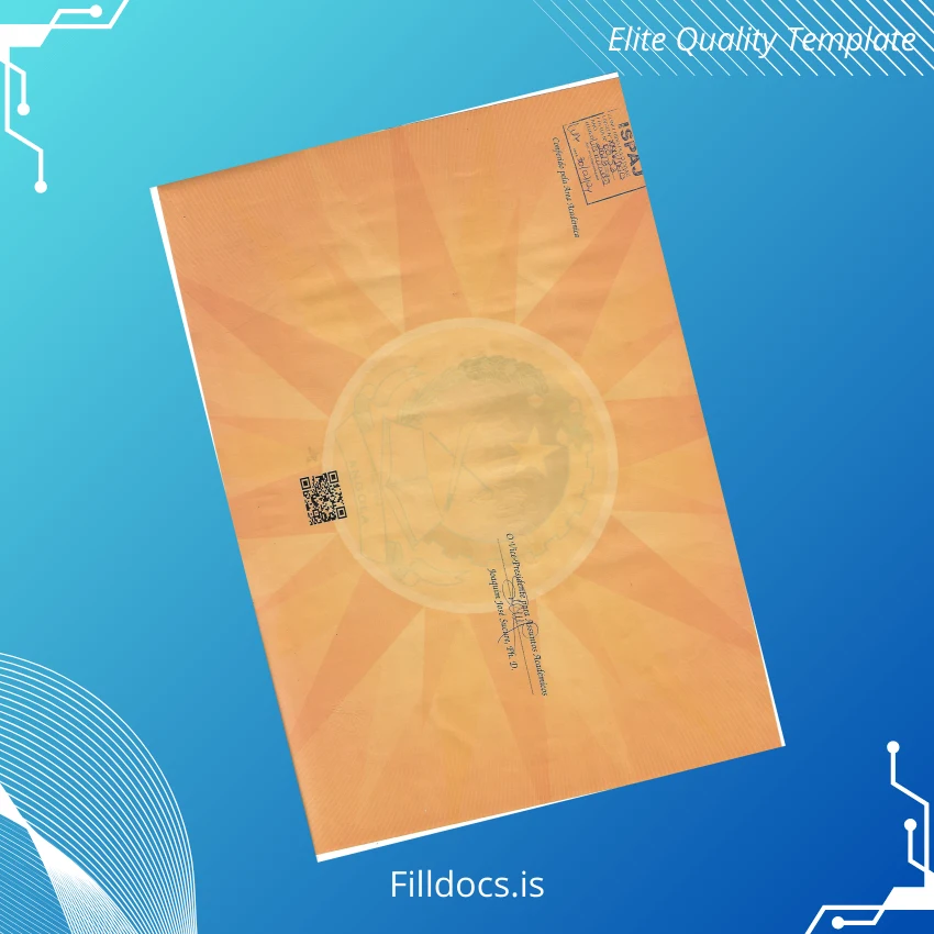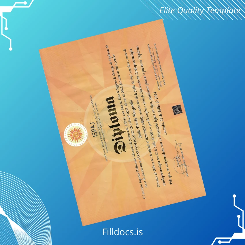 This fillable diploma template addresses major challenges such as document loss, theft, or the need for an updated certification quickly. It is the ideal solution for administrative staff, educational professionals, or graduates aiming to replace or design diplomas with ease, precision, and professional quality. Elevate your diploma issuance process with this expertly crafted Mozambique Instituto Superior Politécnico Jovens da Inventividade diploma template.