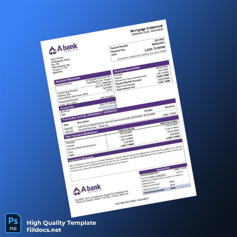 The Myanmar A Bank Mortgage Statement Template is perfect for the busy professional who may have lost important documents or needs an urgent replacement after an unexpected expiration. It resolves the common issue of missing or expired statements by providing a quick, editable solution directly at your fingertips.