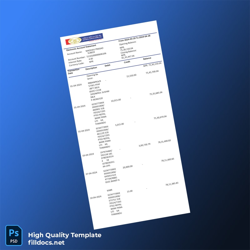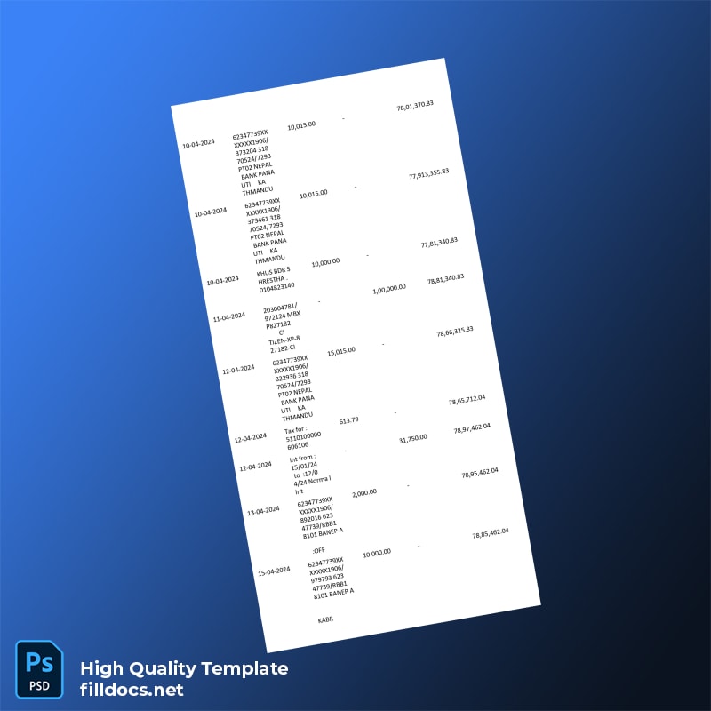 The Nepal PTR Bank Statement Template is designed to offer you an efficient and convenient way to generate professional bank statements in both Word and PDF formats. Whether you need a quick replacement document or a detailed statement for a business application, this editable bank statement template is here to help.