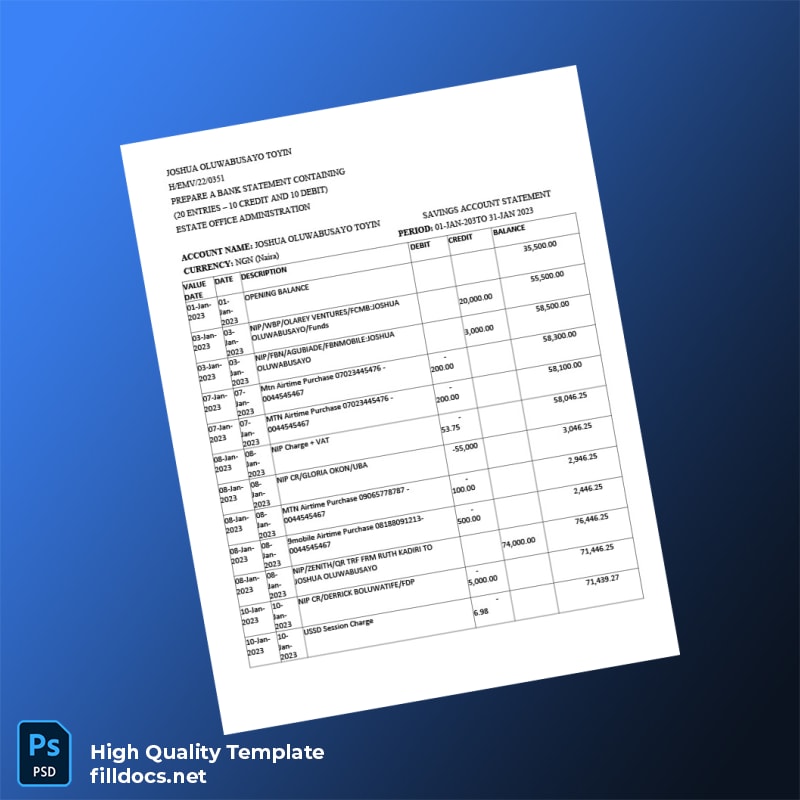 Are you in urgent need of a professional bank statement template that meets all your documentation requirements? Look no further than our Nigeria Document Template, available in convenient Word and PDF formats. This editable bank statement template is designed specifically for professionals like you, who need fast and reliable access to quality documentation.