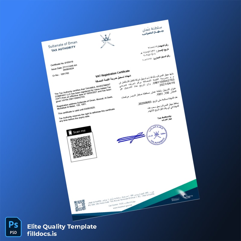 Seamless Oman Tax Authority VAT Registration with Editable Certificate Template