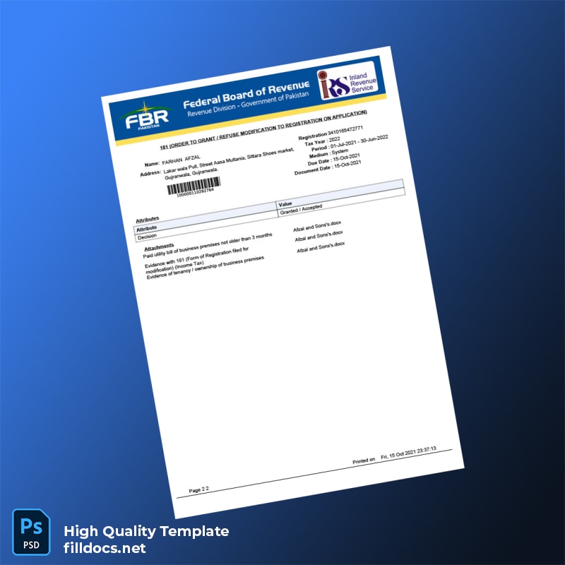 Pakistan Government Editable Tax Registration Modification Order Template in Word and PDF Formats