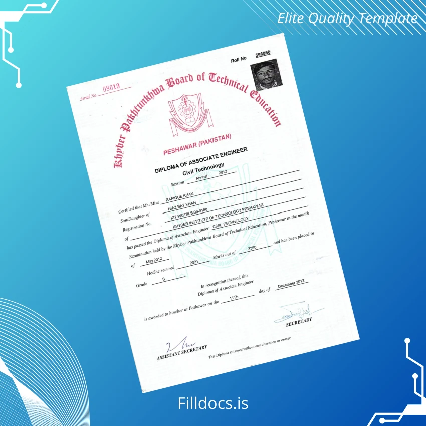 This Pakistan Khyber Institute of Technology Peshawar Diploma of Associate Engineer Template – Word/PDF is a professionally designed, fillable document tailored for those needing a customizable, replacement diploma form with ease of use. It offers a reliable and editable format, perfectly suited for professionals and institutions requiring high-quality digital diploma downloads in a clean, novelty diploma design.