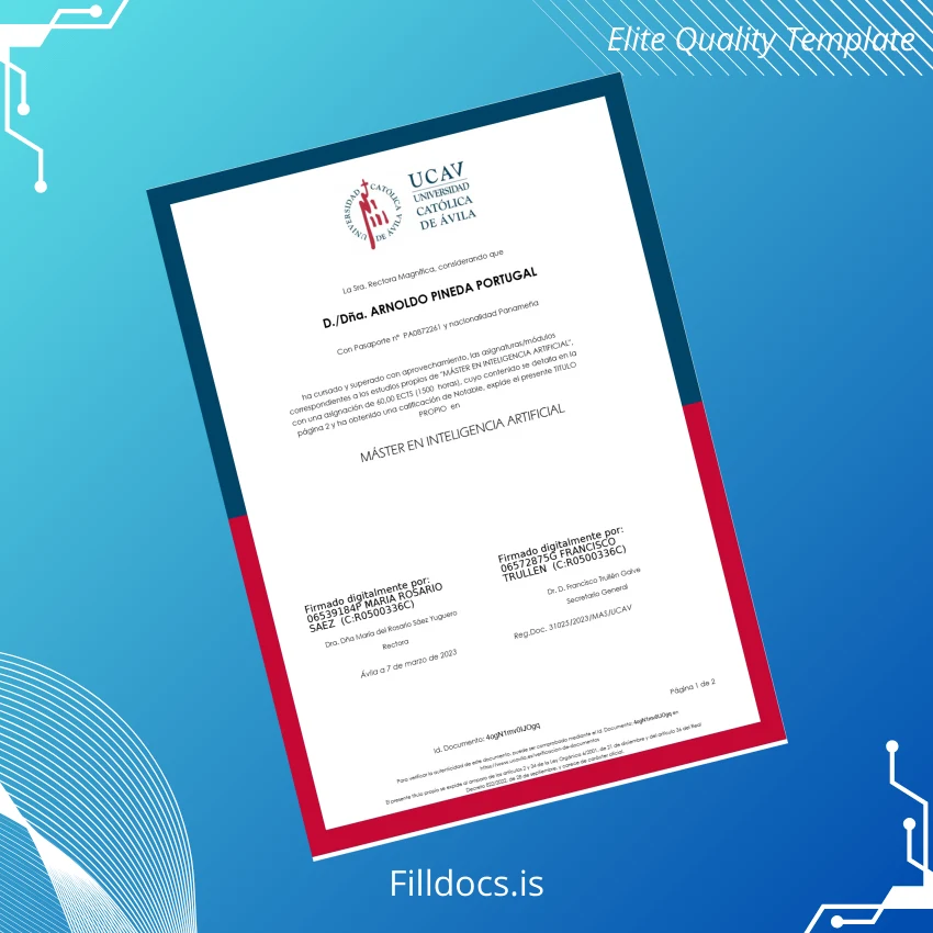 Discover the Panama University of Ávila Master in Artificial Intelligence Template – Word/PDF, a professionally designed, fillable diploma certificate crafted for academic and professional use. This template offers a seamless solution for users seeking an editable and printable diploma that maintains a high standard of visual sophistication and compliance with institutional requirements.