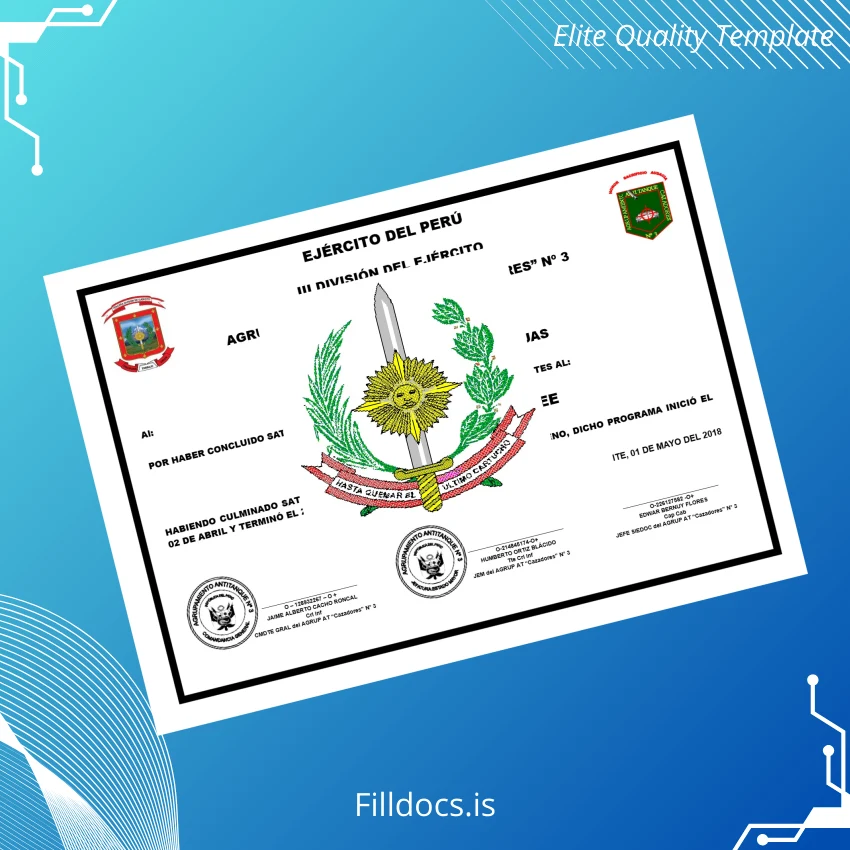 The Peru Army III Division Humvee Driver Course Diploma Template – Word/PDF is a professionally designed, editable certificate template tailored for military-themed documentation needs. This digital diploma download offers users a seamless way to personalize and produce high-quality, formal diplomas suitable for training recognitions, awards, or educational credentials within the military context.