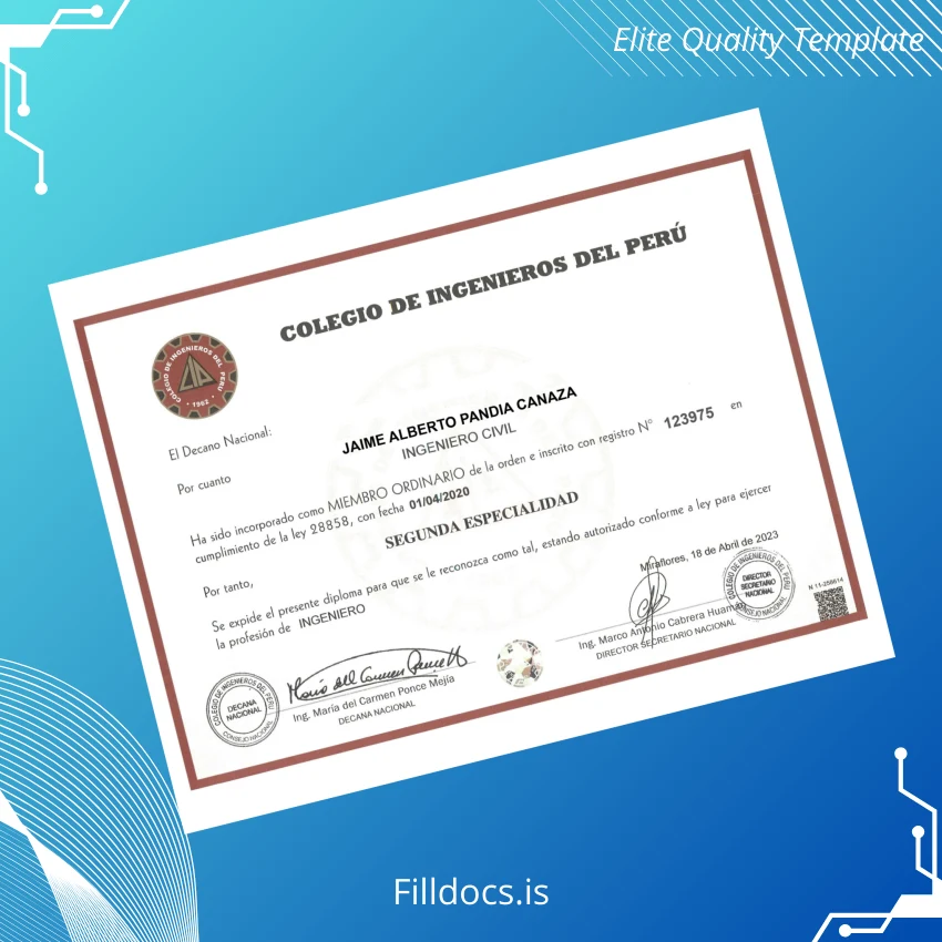 This comprehensive Peru Colegio de Ingenieros del Perú Ingeniero Civil Diploma Template – Word/PDF is a meticulously crafted digital certificate ideal for professionals and institutions seeking a high-quality, customizable diploma design. It offers a swift and user-friendly solution to recreate authentic-looking civil engineering diplomas with editable fields within Word and PDF formats, catering especially to those needing a reliable replacement or novelty diploma design.