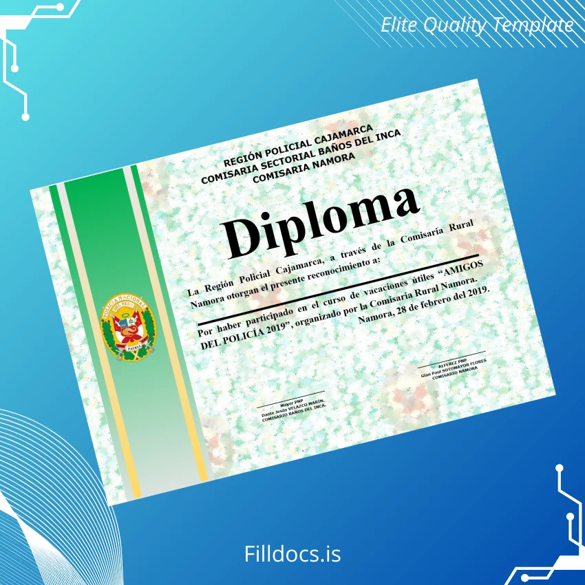 The Peru Comisaria Rural Namora Diploma of Recognition 2019 Template – Word/PDF is a high-quality, editable certificate template designed for professionals seeking a customizable and print-ready document. This fillable diploma template allows users to easily enter personalized information in ready-made fields, making it an ideal solution for replacement diplomas or bespoke degree certificates.