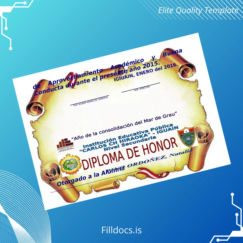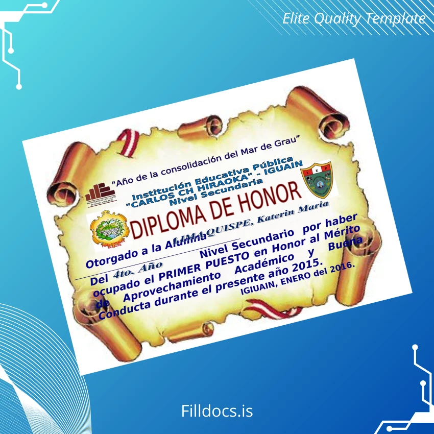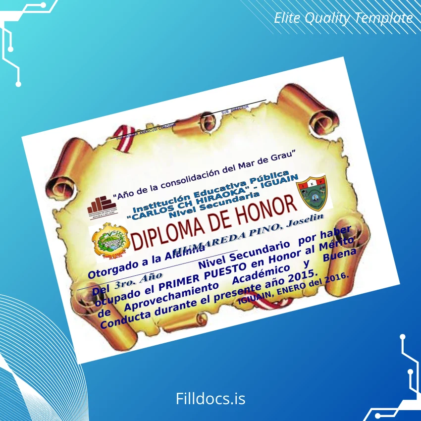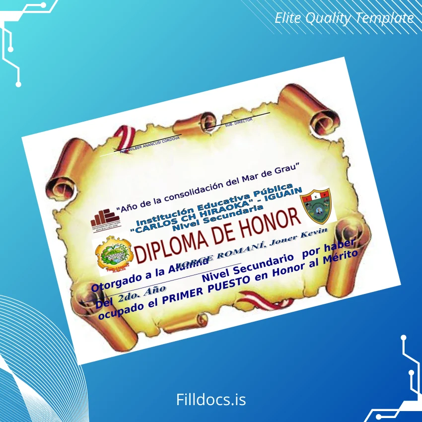 Discover the Peru Educational Institution _Carlos Ch Hiraoka_ High School Diploma Template – Word/PDF, a professionally designed, fillable diploma form tailored for educators, administrators, and individuals seeking a pristine replacement or customized commemorative diploma. This digital diploma download offers an efficient and seamless solution to create authentic-looking, customizable degree certificates with ease.