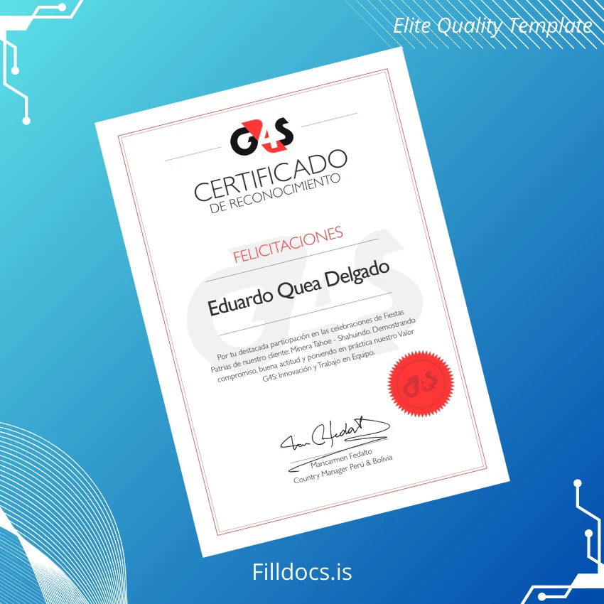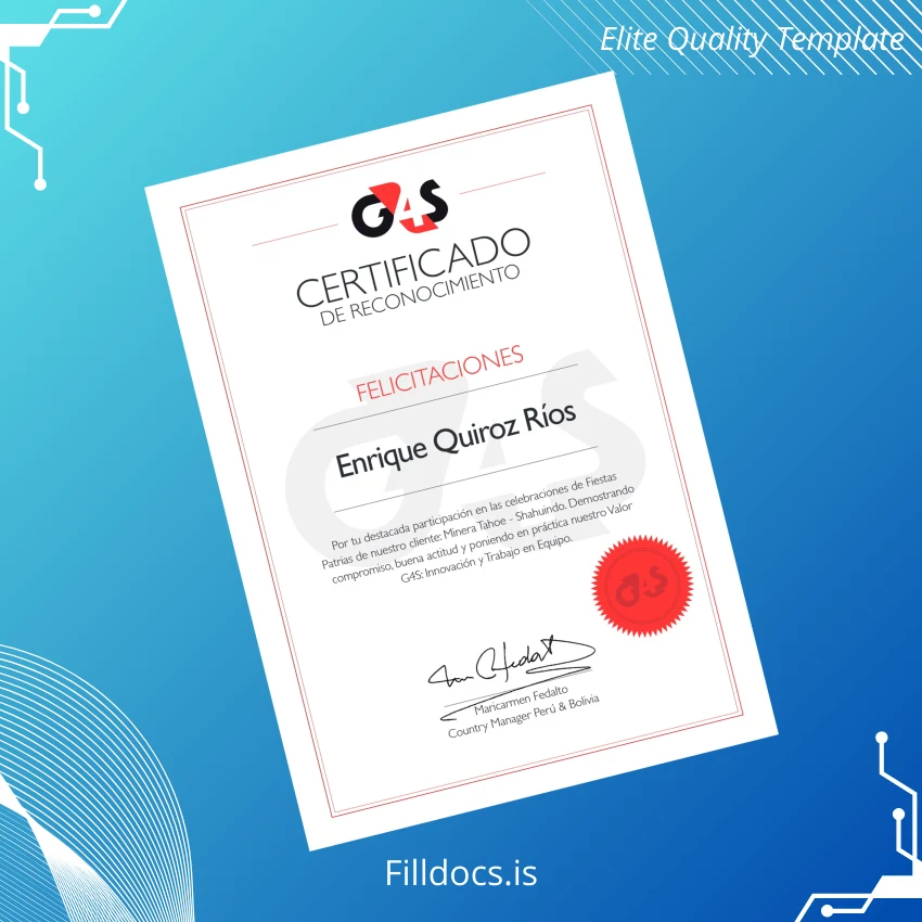 Peru G4S Certificate of Recognition Template – Word/PDF fillable & print-ready for easy, professional certificate customization with editable fields.