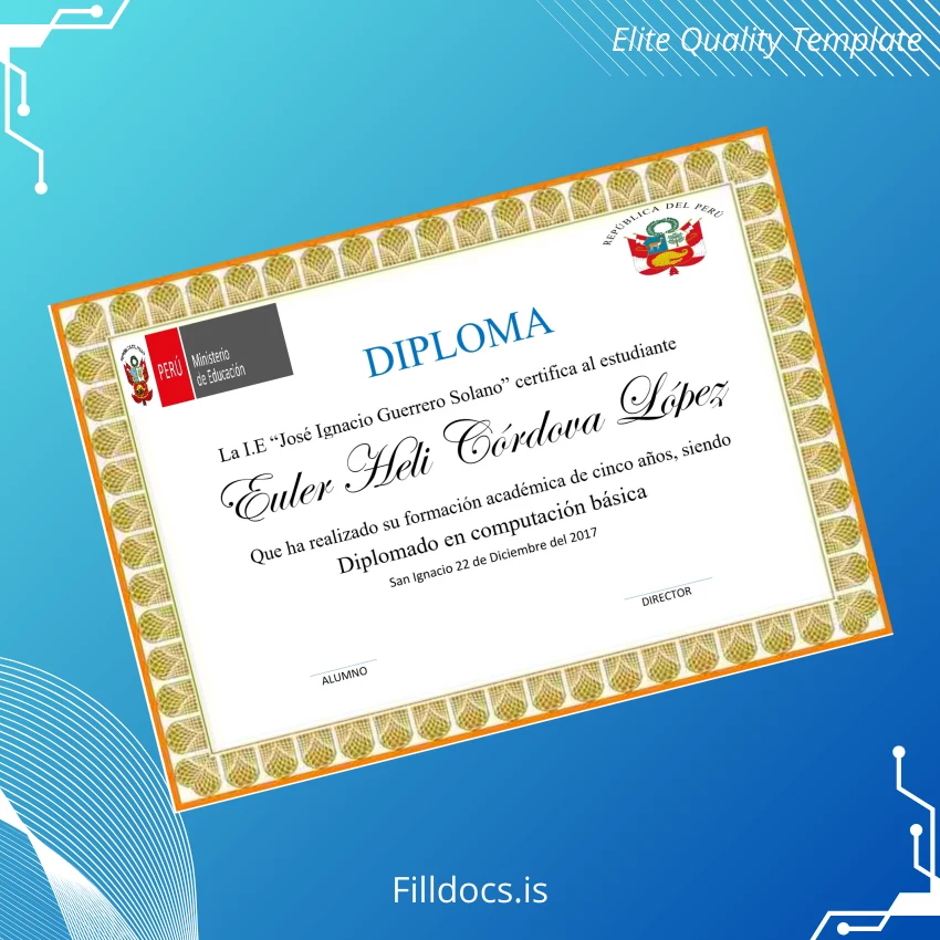 Discover the Peru I.E _José Ignacio Guerrero Solano_ Diploma in Basic Computing Template – Word/PDF, a meticulously designed fillable certificate template tailored for educational institutions, administrative offices, and individuals needing a professional digital diploma. This customizable degree template allows for seamless editing and fast production of official documents, ensuring authenticity and clarity for every academic achievement.