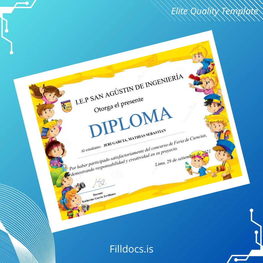 The Peru I.E.P San Agustín de Ingeniería Participation Diploma Template – Word/PDF is a high-quality, editable certificate designed for educators, administrators, and professionals who require a customizable document to recognize achievement swiftly and efficiently. Perfect for those who need a polished, fillable diploma form, this digital template offers a professional alternative to traditional certificate creation, saving time without sacrificing quality.