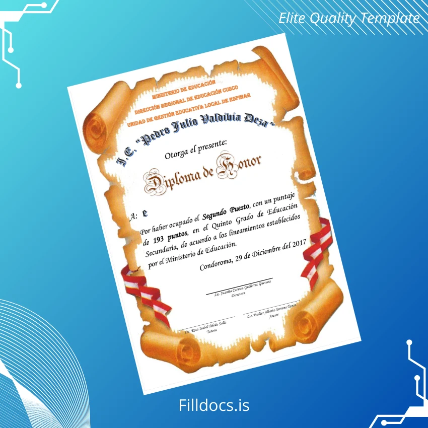 Discover the Peru I.E. Pedro Julio Valdivia Díaz Honor Diploma Template – Word/PDF, a high-quality, fillable diploma design tailored for educators and administrators needing a reliable, customizable certificate solution. This digital diploma download offers an authentic and professional layout, perfectly suited for replacement diplomas or new academic awards.