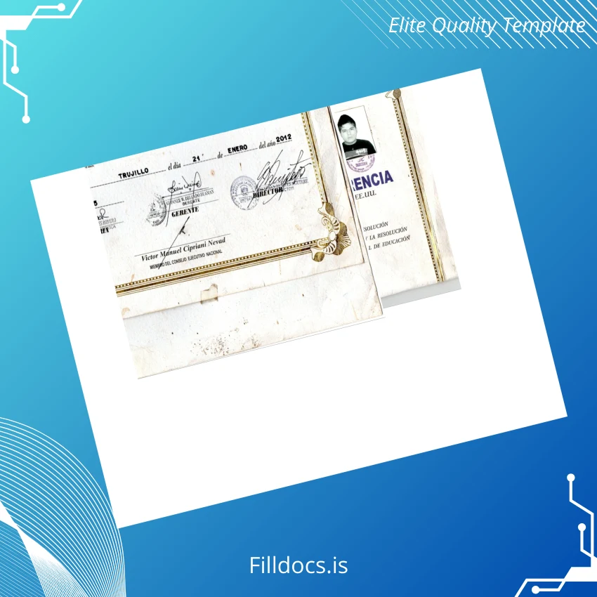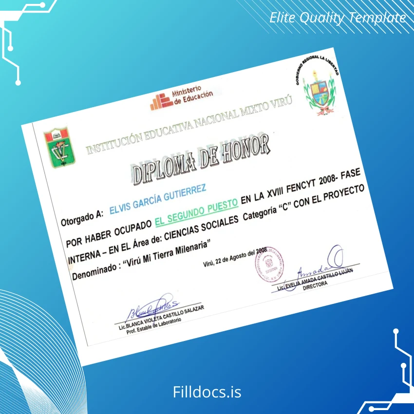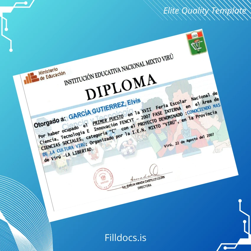 The Peru Institución Educativa Nacional Mixto Virú Diploma Template – Word/PDF is a versatile, fillable certificate designed for educational professionals who require a reliable and customizable template for diploma creation. This high-quality digital asset is ideal for replacing lost or expired diplomas or creating official academic recognitions with ease.