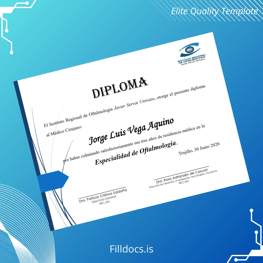 Discover the Peru Instituto Regional de Oftalmología Javier Servat Univazo Medical Surgeon Diploma in Ophthalmology Template – Word/PDF, a fillable and professional certificate designed for seamless customization. This digital diploma template offers a perfect solution for universities, medical professionals, and institutions requiring an editable and authentic-looking degree format. Crafted to meet modern standards, it ensures a high-quality presentation that reflects credibility and prestige.