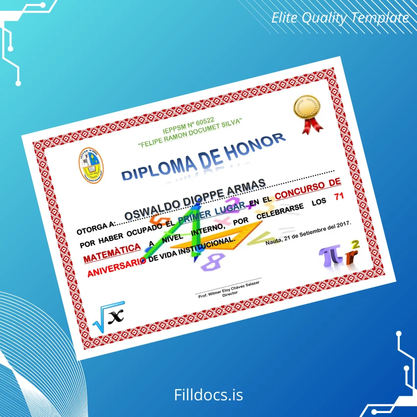 Discover the Peru Jepps N° 60522 Diploma of Honor Template – Word/PDF, a versatile and professionally designed certificate template perfect for academic and professional recognitions. This fillable diploma form offers an elegant, customizable design that meets high standards of quality and flexibility, enabling users to effortlessly create official-looking diplomas with personalized details.