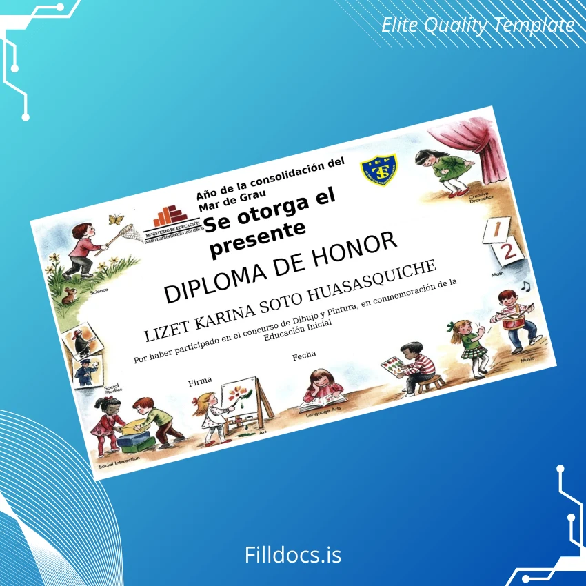 This fillable diploma template is a digital document that provides a high-quality replica of the Peru Ministry of Education Honor Diploma. It is designed in both Word and PDF formats, crafted to ensure users can personalize every essential detail, including recipient name, date, and award specifics, resulting in an authentic and official-looking certification.