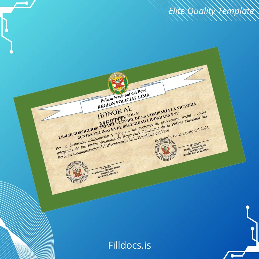 This Peru National Police Recognition Diploma Awarded to Leslie Rospigliosi Tellez for Community Service Template – Word/PDF is a high-quality, fillable digital document designed specially for official recognition purposes. Ideal for professionals and organizations needing a customizable and authentic-looking diploma, this template offers a seamless editing experience suitable for Word and PDF platforms. It ensures that you can promptly replace or create an authentic community service recognition diploma without compromise on quality or detail.