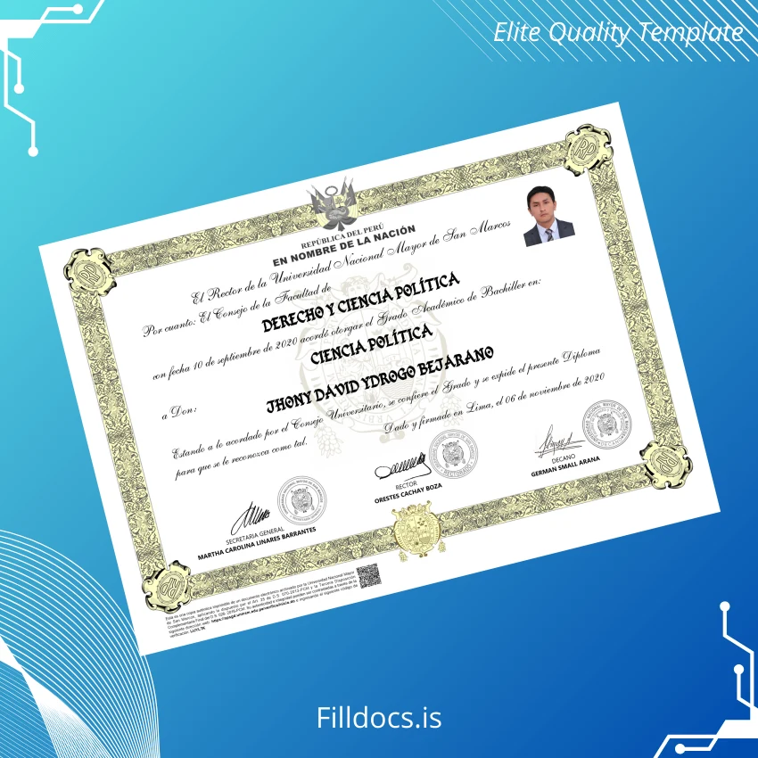 This product is a customizable Bachelor of Political Science diploma template specifically tailored for Peru National University of San Marcos graduates. Available in both Word and PDF formats, it provides a blank diploma form that users can fill with personal data, ensuring a novel diploma design that matches official standards. It serves as a trustworthy replacement diploma template for those who need to digitally download a high-quality replica.