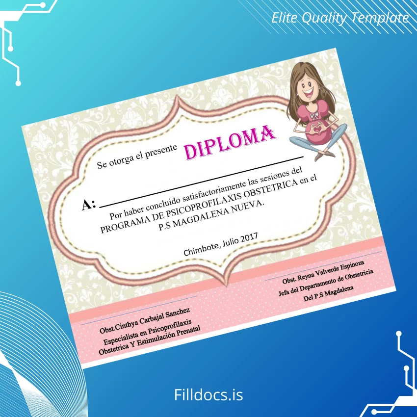 Discover the Peru P.S Magdalena Nueva Diploma in Obstetric Psychoprophylaxis Template – Word/PDF, a meticulously designed fillable diploma ideal for educators and institutions needing a professional, easy-to-edit certification solution. This digital diploma download is tailored for those who require a swift, reliable replacement diploma template or a customizable degree template to memorialize academic achievements in obstetric psychoprophylaxis.