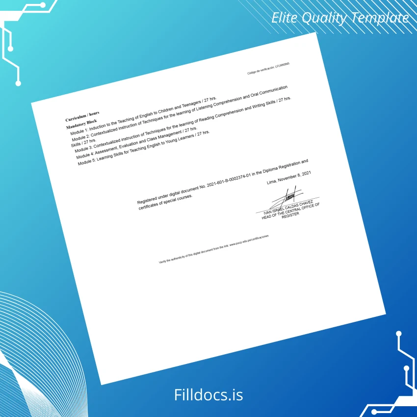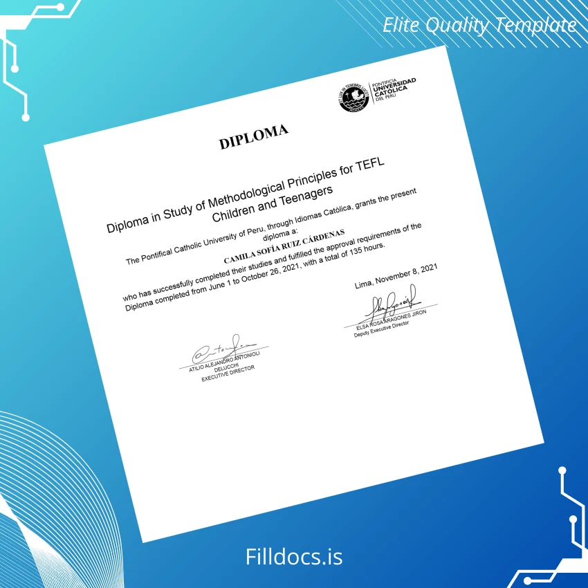 Enhance your credential presentation with the Peru Pontifical Catholic University of Peru Diploma in Study of Methodological Principles for TEFL Children and Teenagers Template. This thoughtfully designed, fillable digital diploma offers a seamless solution for educators, institutions, and students needing a professional and customizable certificate. Ideal for academic professionals who require a reliable and elegant diploma that can be tailored without hassle, this template integrates advanced design quality with user-friendly editing capabilities.