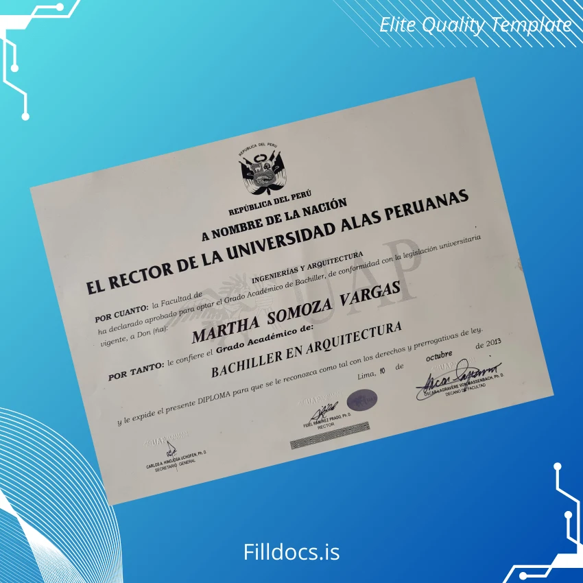 This template is a high-quality, customizable diploma certificate specifically crafted for graduates of the Bachelor of Architecture program at Universidad Alas Peruanas in Peru. It offers a blank diploma form layout that combines elegance with authenticity, perfectly suited for creating a replacement diploma or a professional document for presentation purposes.