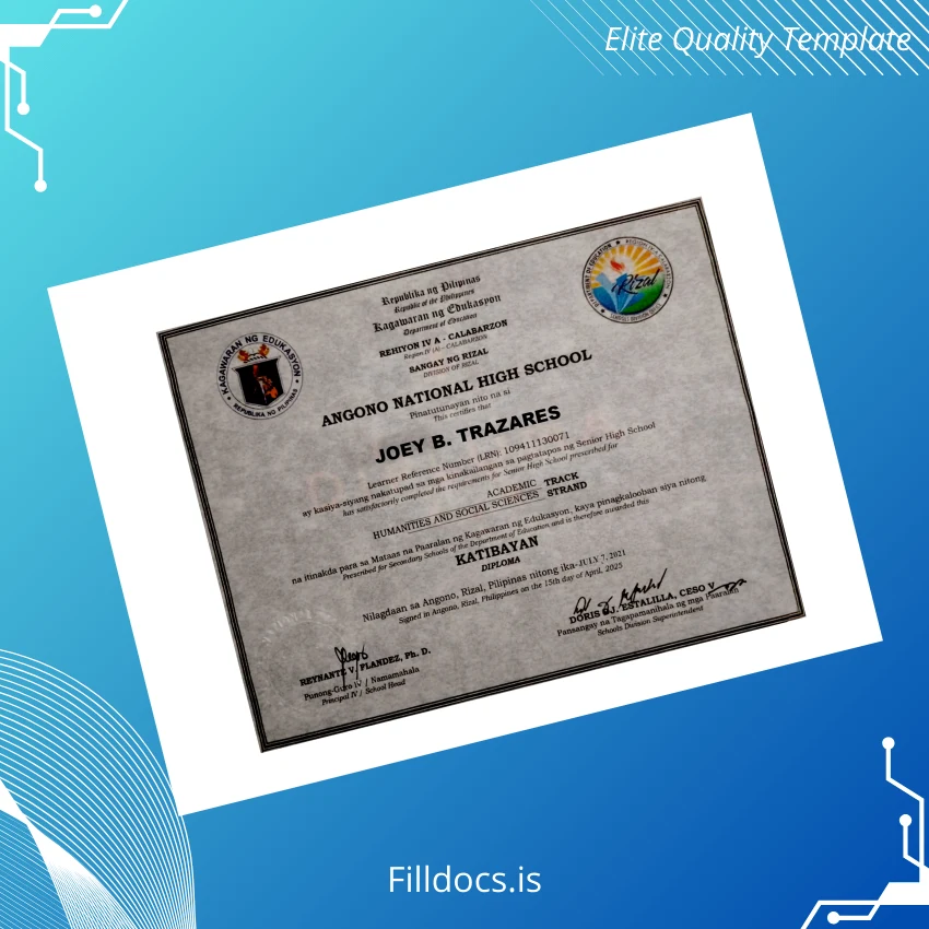 Discover the Philippines Angono National High School High School Diploma Template – Word/PDF, a high-quality digital solution designed for professionals seeking a customizable and fillable diploma form. This exclusive template perfectly balances traditional academic aesthetics with modern editing flexibility, ensuring a professional and polished final document ideal for educational or replacement purposes.