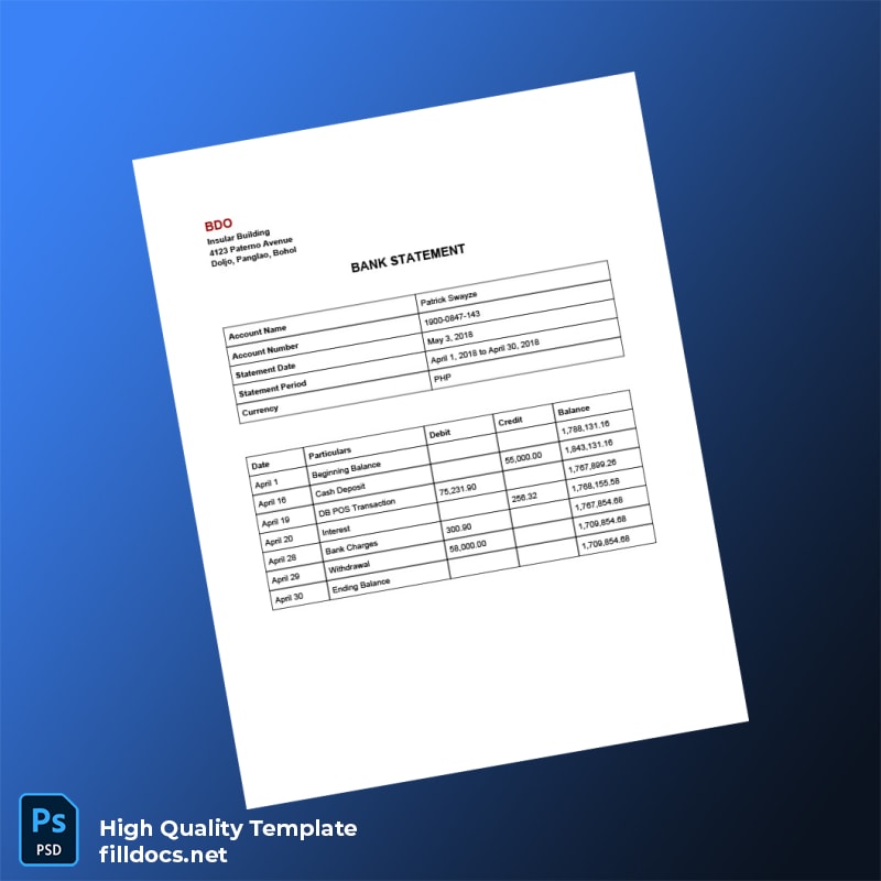 Philippines BDO Bank Statement Template in Word and PDF Formats