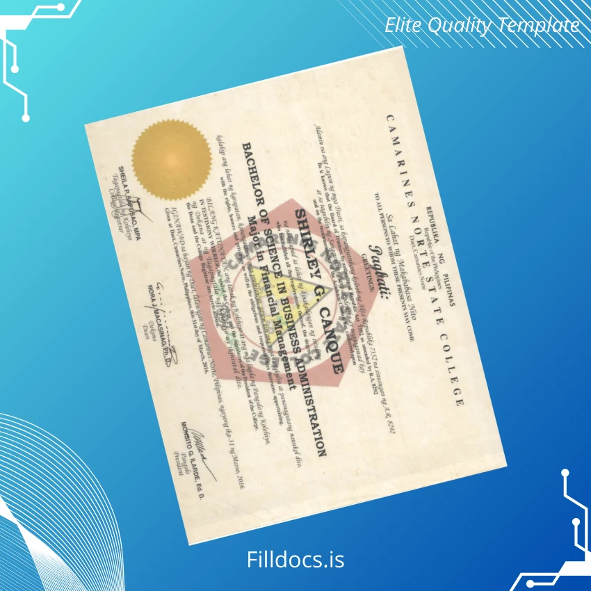Discover the Philippines Camarines Norte State College Bachelor of Science in Business Administration Template – Word/PDF, a professionally designed, fillable diploma form crafted for ease and versatility. This digital diploma download is ideal for those seeking a customizable degree template that allows quick, effortless personalization of essential certificate details. Whether you need a replacement diploma template or a novelty diploma design, this document caters perfectly to educators, students, and professionals looking to restore or produce an authentic-looking certificate.