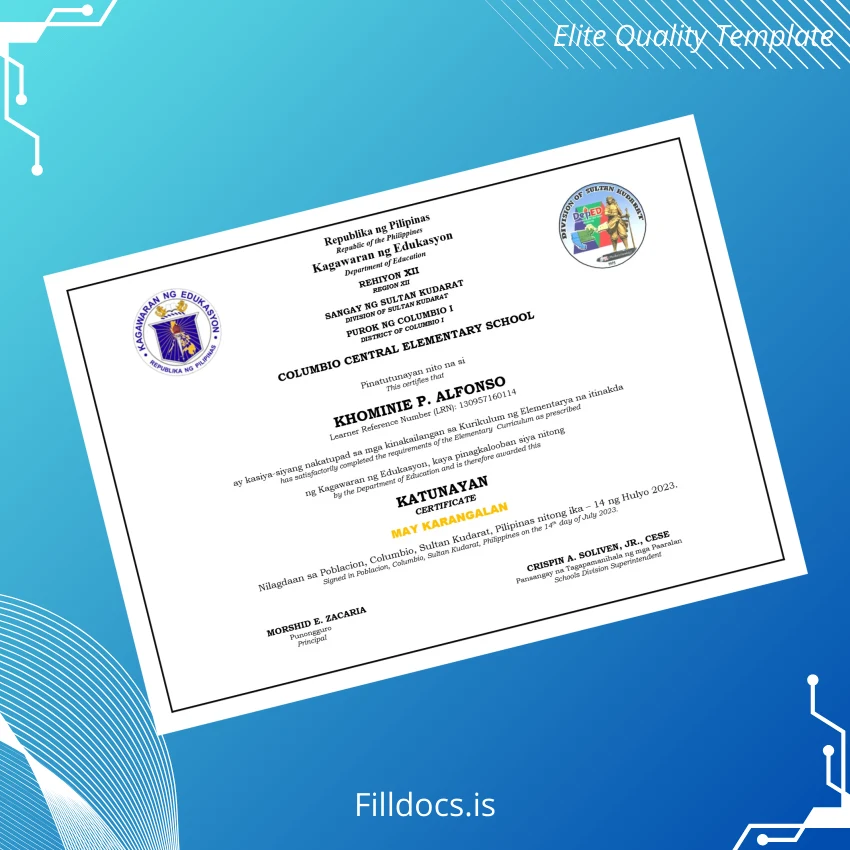 The Philippines Columbio Central Elementary School Elementary Completion Certificate Template – Word/PDF is a professional, fillable document designed for quick customization and high-quality presentation. Ideal for educators, administrators, and individuals who require a prompt and easy-to-edit certificate, this template meets the standards for official elementary school completion recognition.