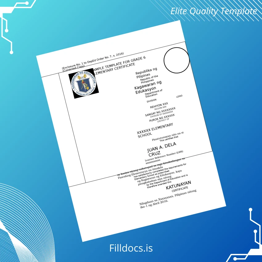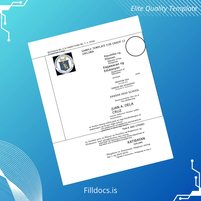 This editable diploma template is a fully customizable and blank diploma form designed specifically to replicate the official Philippines Department of Education high school diploma. It serves as a replacement diploma template and novelty diploma design that you can personalize with ease, making it perfect for those who require an accurate and professional diploma certificate.