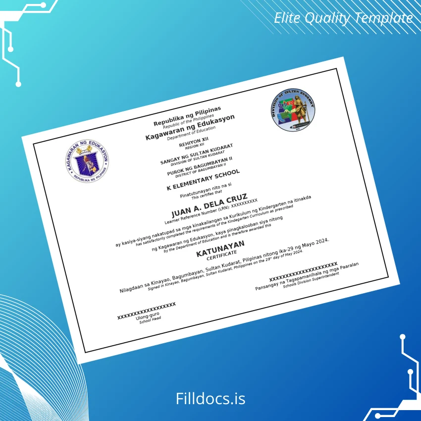 Discover the Philippines K Elementary School Kindergarten Completion Certificate Template – Word/PDF, a versatile and professional tool designed to create authentic, customizable certificates for Kindergarten graduates. This editable diploma template offers a seamless blend of quality design and functionality tailored for educators, administrators, and printing professionals who require an efficient and visually appealing document for academic recognition.