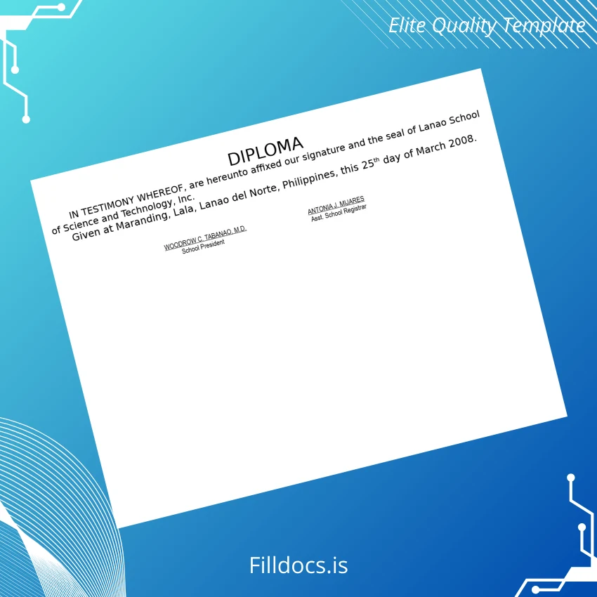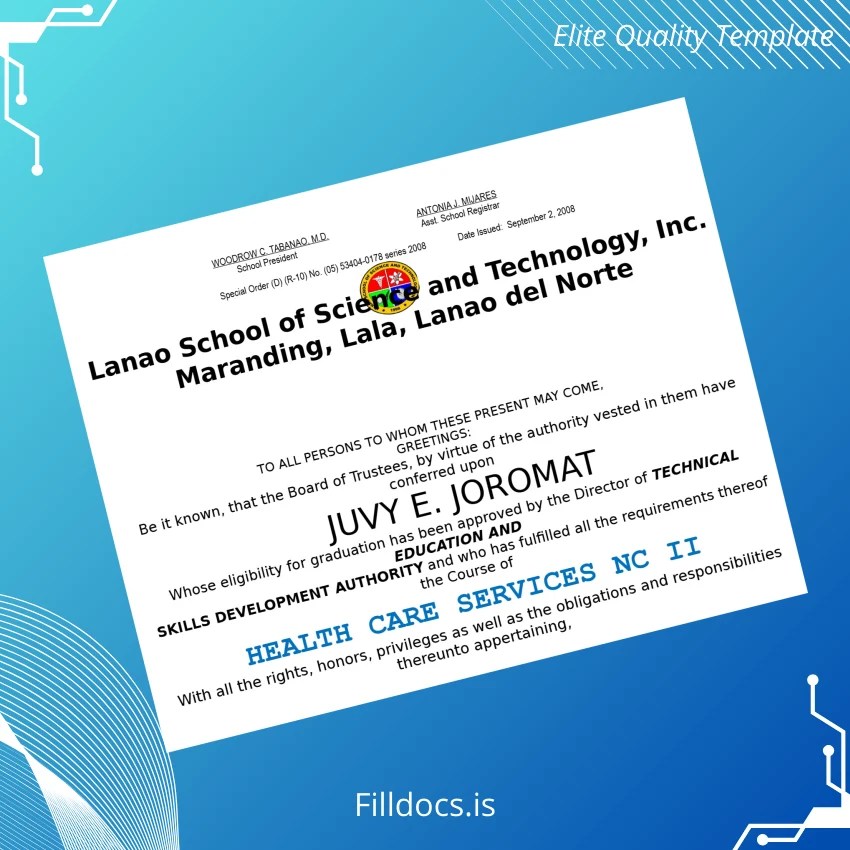 This template is a carefully crafted digital diploma certificate for the Philippines Lanao School of Science and Technology Inc’s Two-Year Information Technology program. It serves as a ready-made, fillable document that can be customized to accurately reflect student details, graduation dates, and authorized signatures. Ideal for swift replacement diploma needs, it maintains the formal appearance required for official recognition.