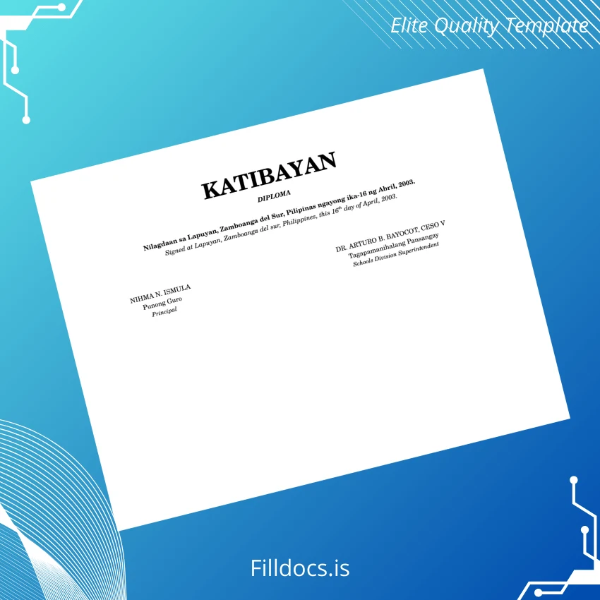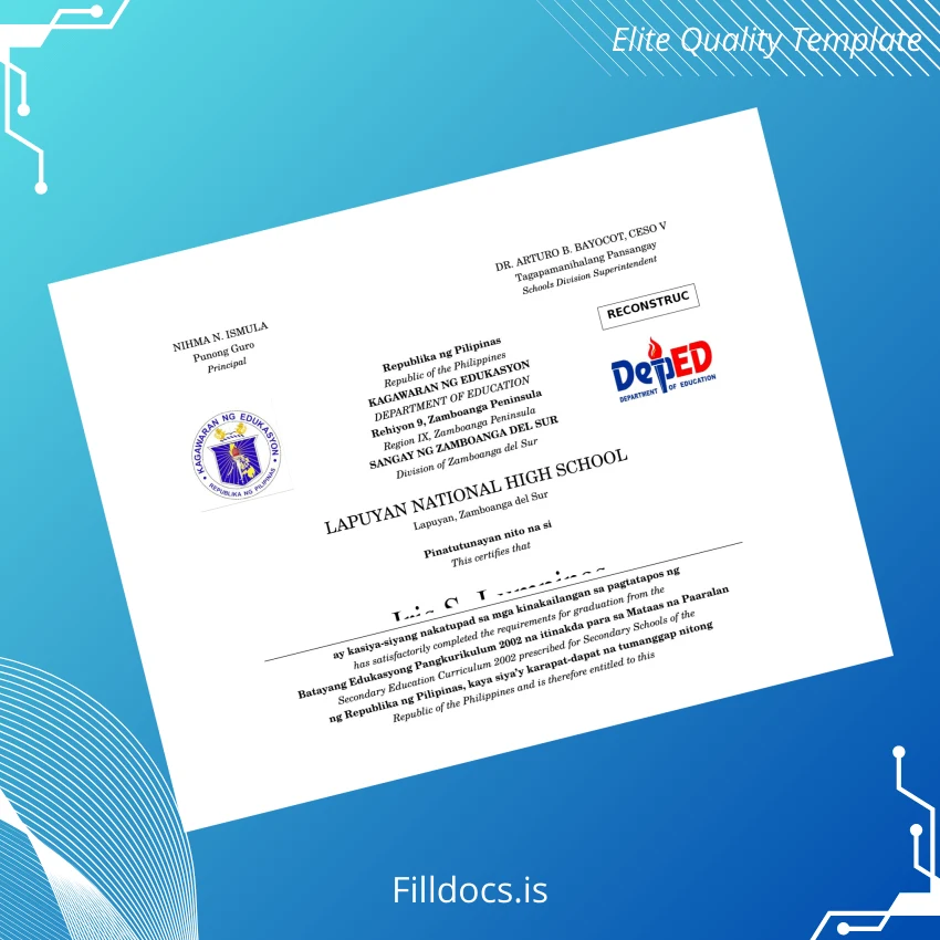Discover the Philippines Lapuyan National High School High School Diploma Template – Word/PDF, a professional and fully editable digital diploma designed to meet your replacement or customization needs effortlessly. This fillable diploma form allows users to personalize every detail with ease, making it an ideal solution for educators, administrators, and graduates seeking a high-quality certificate that reflects their achievements accurately.